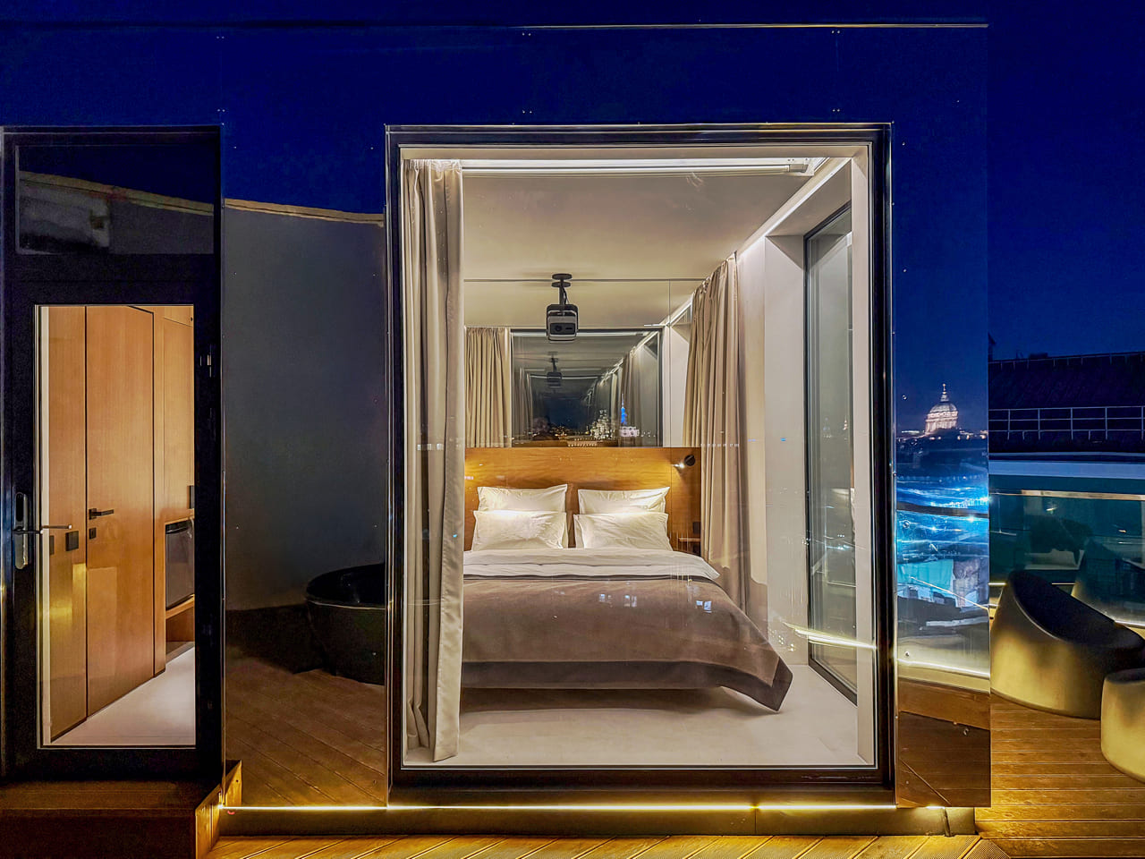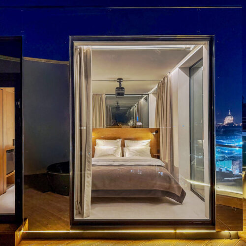 Сити-глэмпинг «Скайфолл» — единственная в своем роде зона фиджитал-спа, буквально парящая над центром Петербурга. Комплекс состоит из группы современных модулей (руф-лоджей) с зеркальными фасадами снаружи и «умным домом» на голосовом управлении внутри с климат контролем, кроватью-трансформером, проектором с большим экраном, чайной станцией.