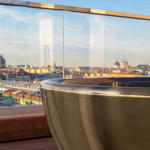 Спа-комплекс «Скайфолл» — это уникальный и амбициозный проект редевелопмента крыши делового центра «Лениздат», одного из самых высоких зданий Сенного округа. В 2023 году здесь был открыт эксклюзивный пентхаус площадью 230 квадратных метров, позже преобразившийся в общественное спа-пространство. А весной 2026 года появился сити-глэмпинг — группа руф-лоджей (от английского roof — крыша, lodge — небольшой дом) — высокотехнологичных юнитов с парной и тёплой открытой купелью.