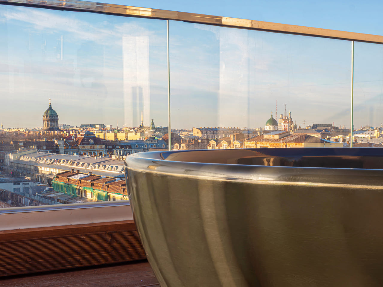 Жемчужиной пространства является видовое джакузи с панорамой на центр Петербурга. Нотку гармонии в программу добавляет душевное чаепитие.